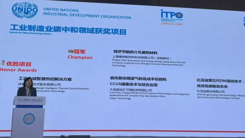 On September 29, 2025, the 4th Carbon Neutrality Technology Solution Solicitation and Evaluation Conference, hosted by the United Nations Industrial Development Organization (UNIDO), concluded in Shanghai. Shanghai Youna New Materials Technology Co., Ltd. (hereinafter referred to as "Youna New Materials") stood out from fierce competition in the carbon neutrality field of industrial manufacturing and claimed the top prize with its "economical and energy-efficient mesoporous thermal insulation material solution."